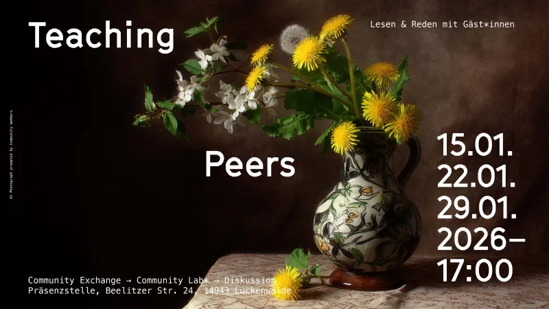 Im Januar lädt die Präsenzstelle Luckenwalde zur Austauschreihe Teaching Peers ein. In hybriden Veranstaltungen kommen Menschen aus Wissenschaft, Kunst, Kultur und Community-Arbeit zusammen, um gemeinsam zu lesen, zu diskutieren und Impulse für soziale Innovation zu entwickeln. Offen, vielfältig und kostenfrei – in unserer Hochschul-Präsenzstelle in Luckenwalde und digital.