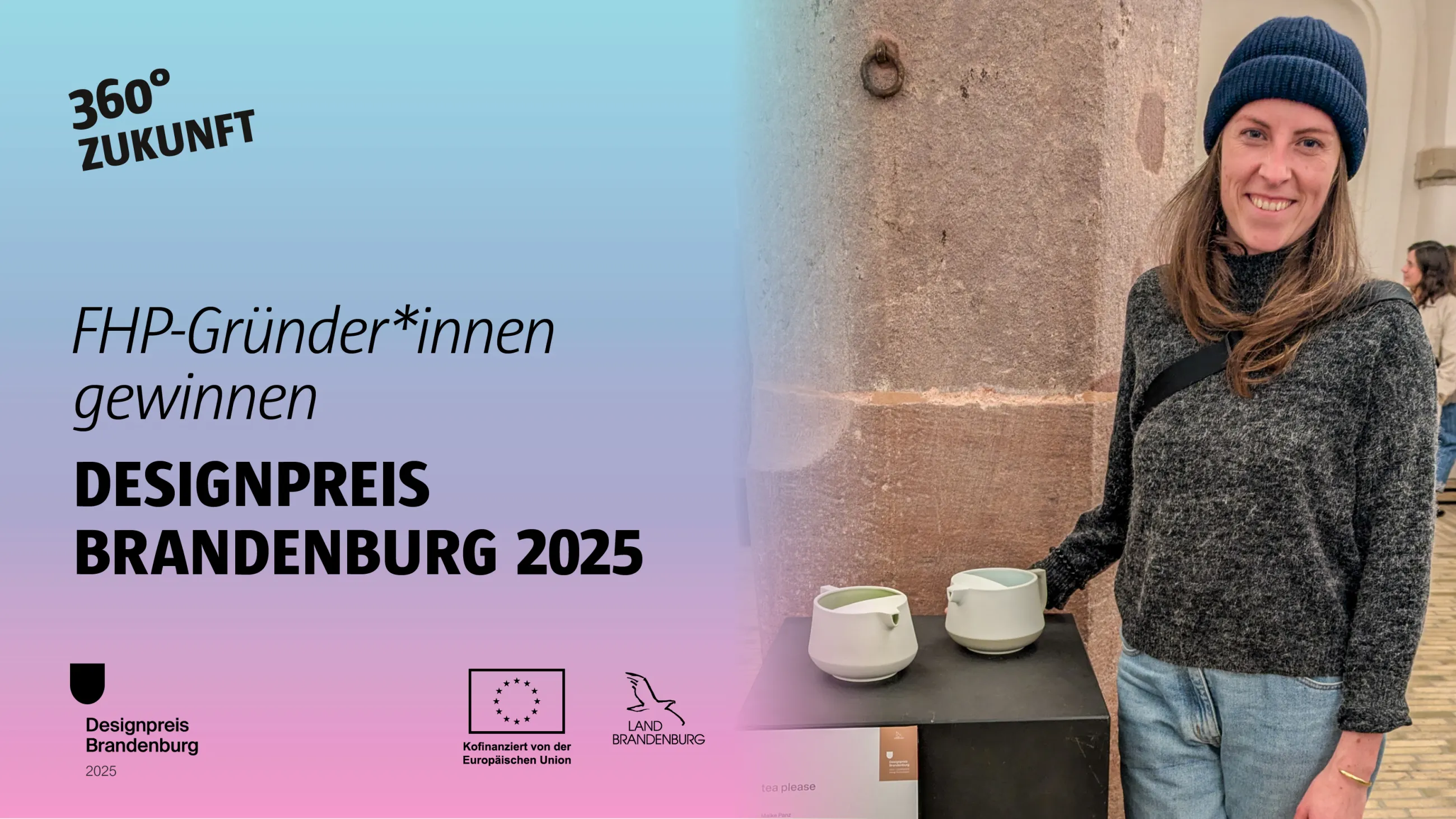 Von den insgesamt zwölf ausgezeichneten Projekten ist ein Großteil (ehemaligen) Angehörigen des Fachbereichs Design der Fachhochschule Potsdam zuzuordnen. Vier der Gewinner*innen wurden in der Vergangenheit durch den Gründungsservice von 360° ZUKUNFT unterstützt. Das sind die Preisträger*innen der FHP: