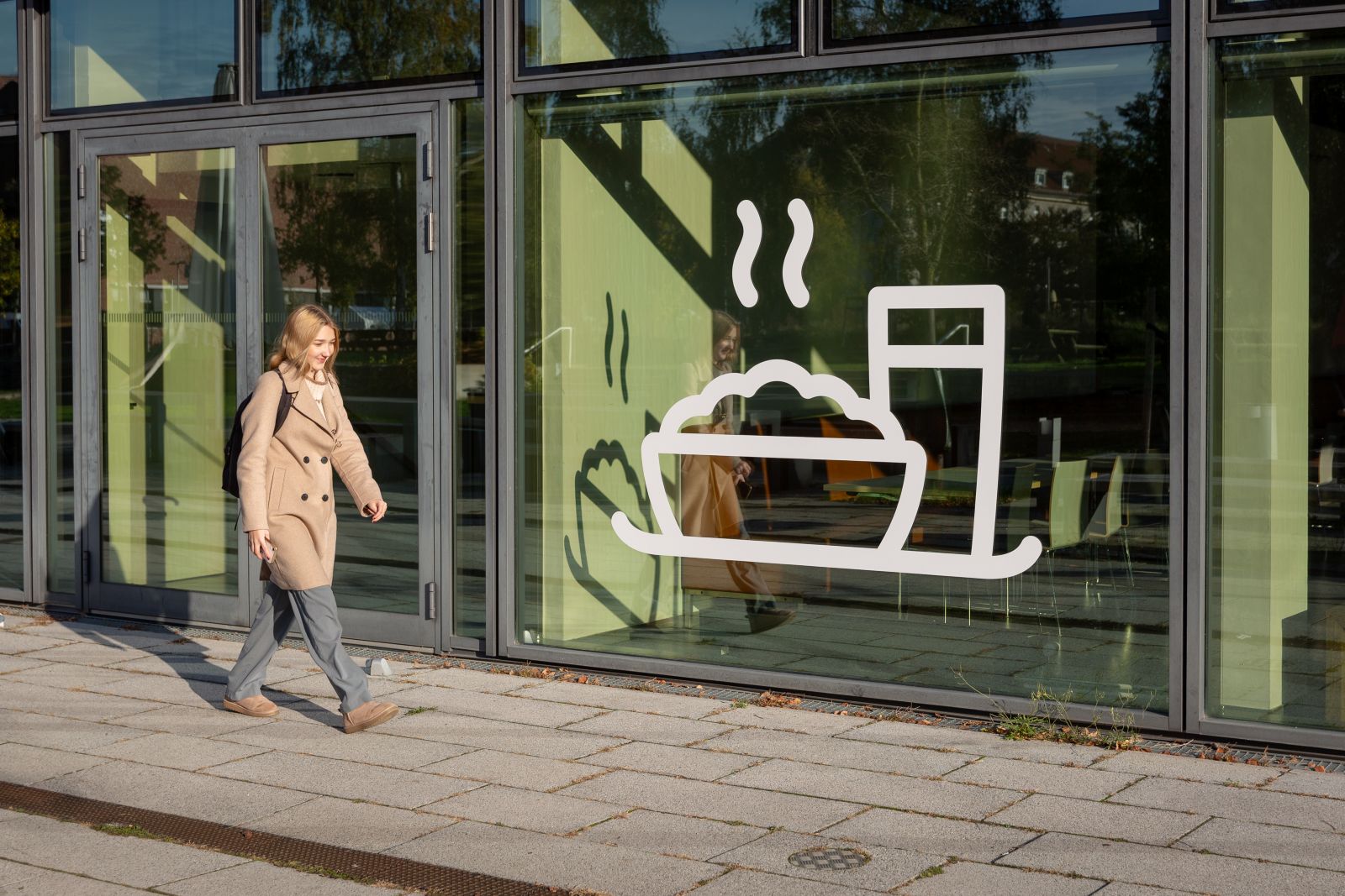 Eine eigens für die FHP gezeichnete Piktogramm-Familie macht das Campusleben in Zukunft in seiner Vielfalt deutlich. Besonders wichtige Serviceangebote werden großformatig auf der Fassade des Hauptgebäudes sichtbar. Ihre ortsgenaue Positionierung ermöglicht eine intuitive Orientierung.