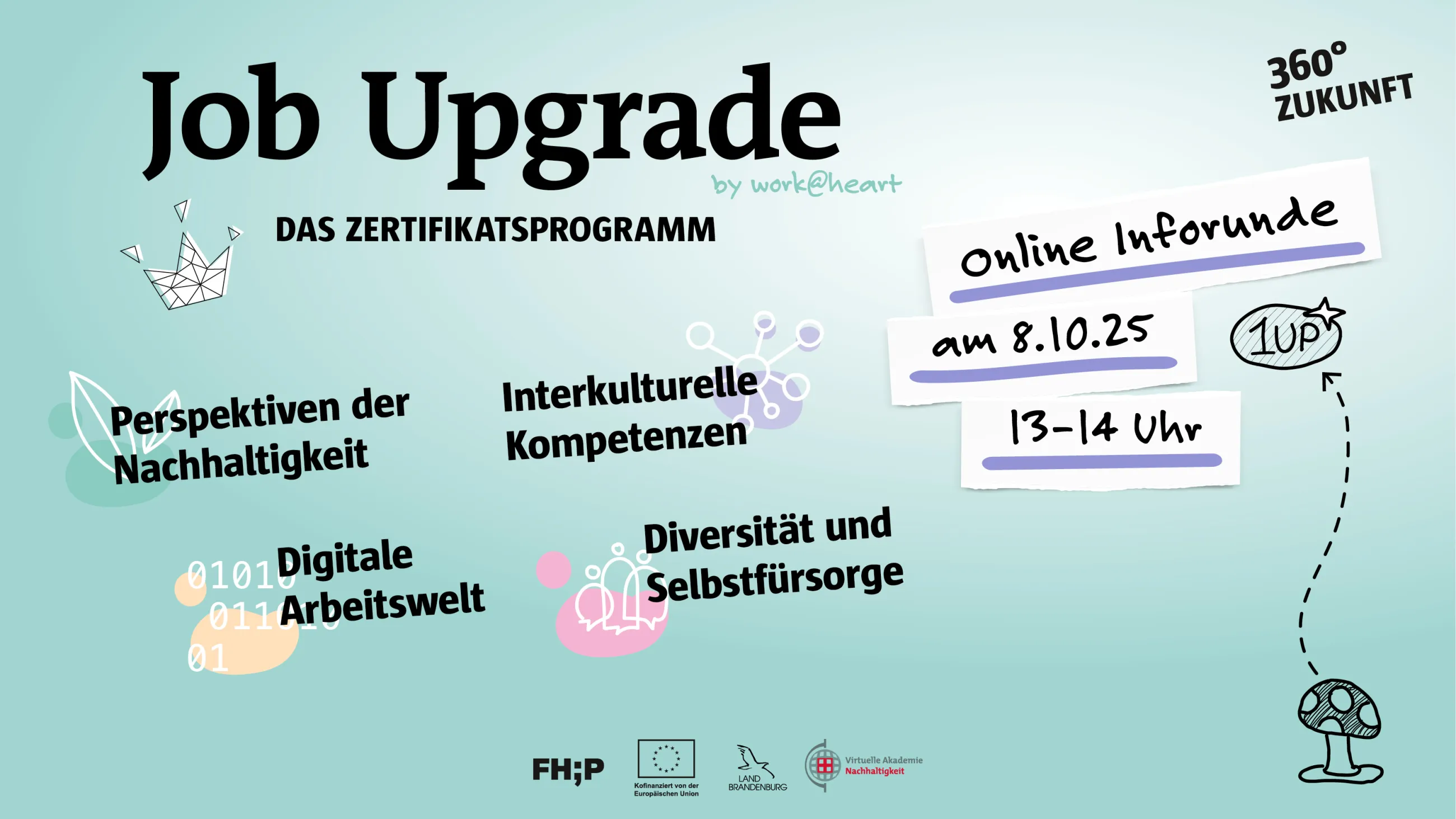 Die Online-Informationsveranstaltung gibt einen kompakten Überblick zum Job Upgrade, den thematischen Inhalten, zum Ablauf und ist selbstverständlich offen für alle Fragen. Zur Teilnahme bitte über den unten stehenden Zoom-Link einwählen.
