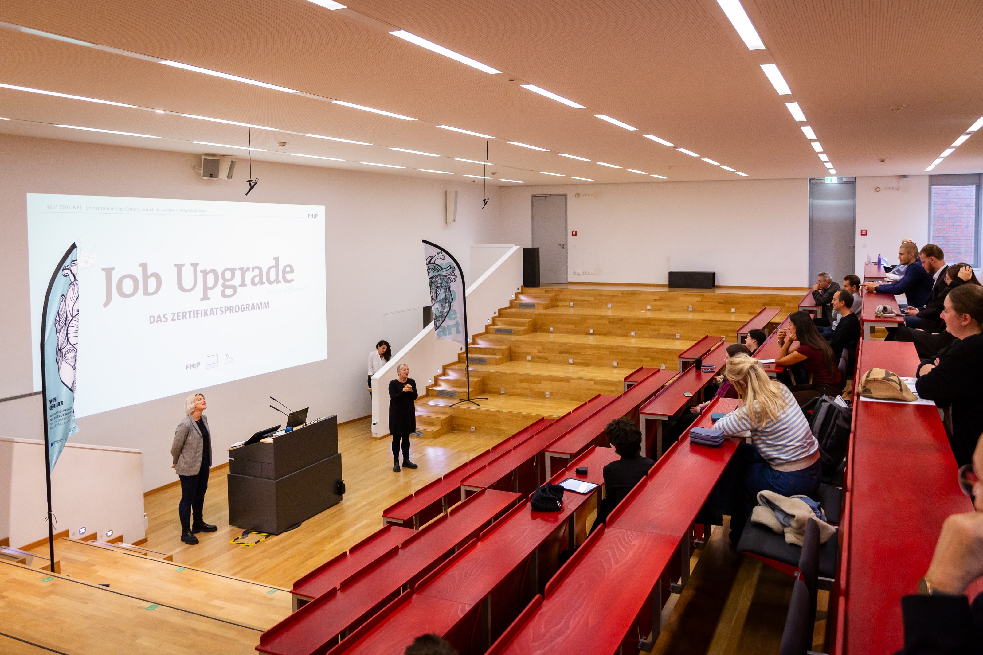 Am 15. Oktober 2025 erhielten erstmals die Absolvent*innen des Job-Upgrade Zertifikatsprogramms ihre Zertifikate. Zugleich starteten die neuen Teilnehmer*innen ins Programm. Einen Einblick in die Workshops und Angebote des Job Upgrades konnten alle Anwesenden durch den Erfahrungsbericht von Studentin Marlene Hoffmann gewinnen. Insgesamt 31 Studierende meldeten sich für den zweiten Durchgang des Job Upgrades für einen oder mehrere der vier Schwerpunkthemen an.