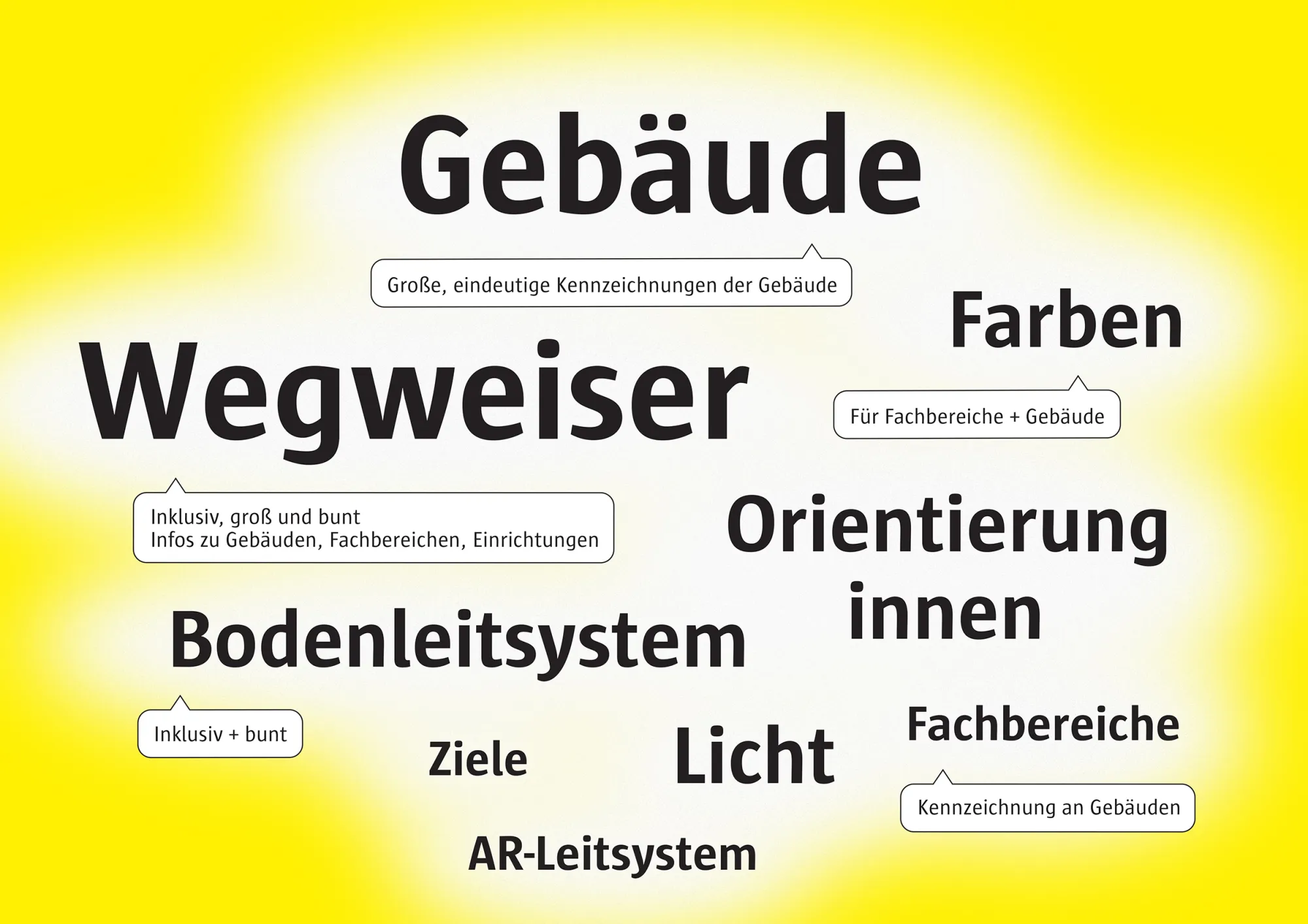 Work on the orientation system began in 2022 in interdisciplinary design seminars (design and architecture) led by Prof Christina Poth and was transformed into a holistic project by the Design Studio Leitsystem in 2024. The involvement of the university community was crucial to the development.