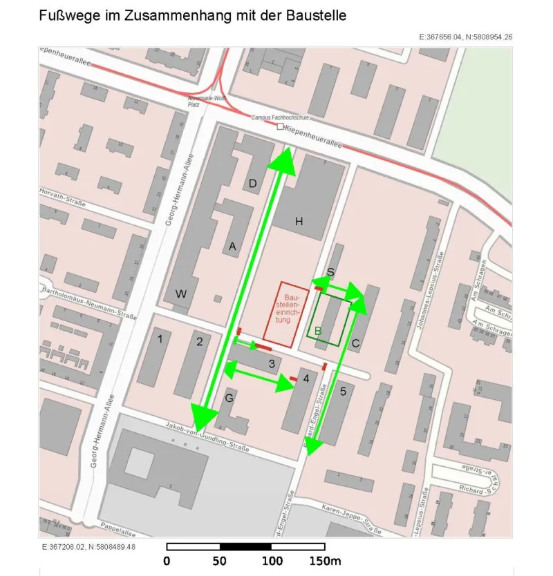 To protect all pedestrians, designated footpaths will be set up, signposted and passages marked with barrier posts. The safe footpaths are shaded green on the enclosed site plan. The access road to and from Kiepenheuerallee will remain passable.