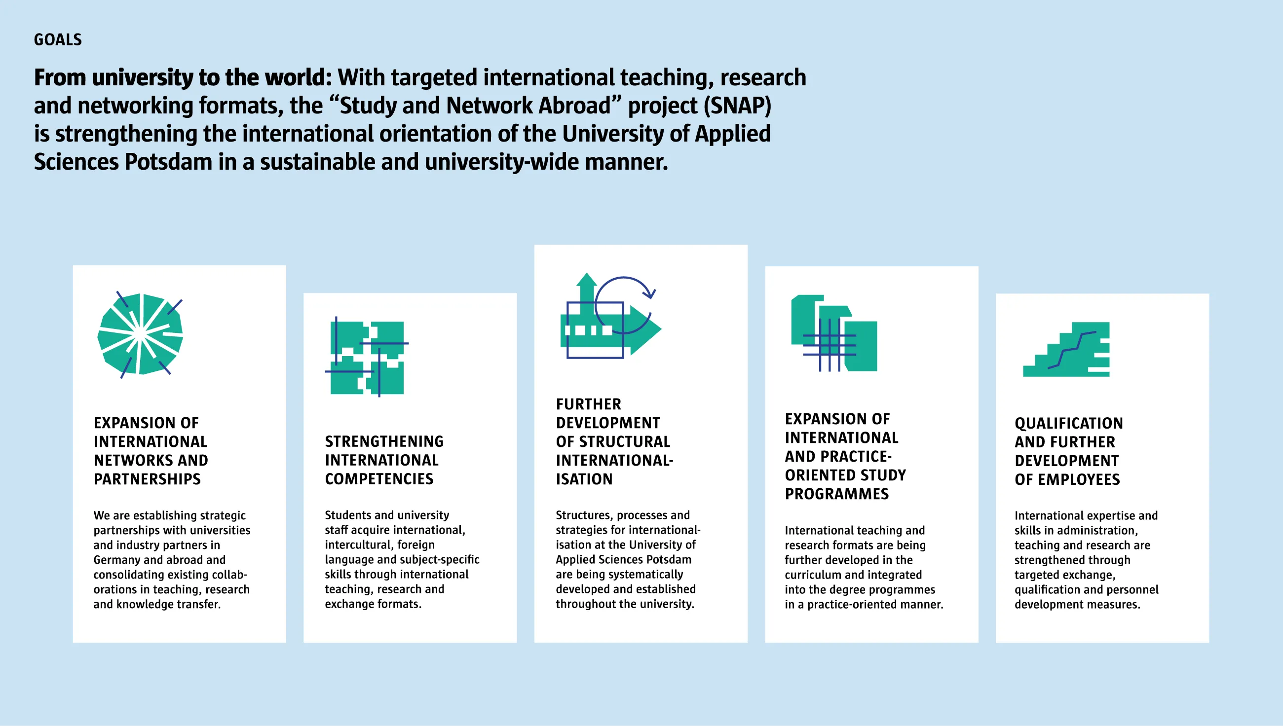 The project's objectives are: The expansion and consolidation of international networks and strategic partnerships anchoring international teaching and research formats in degree programmes, strengthening the international skills of students, teaching staff and employees further development of the structural and strategic internationalisation of the University of Applied Sciences Potsdam