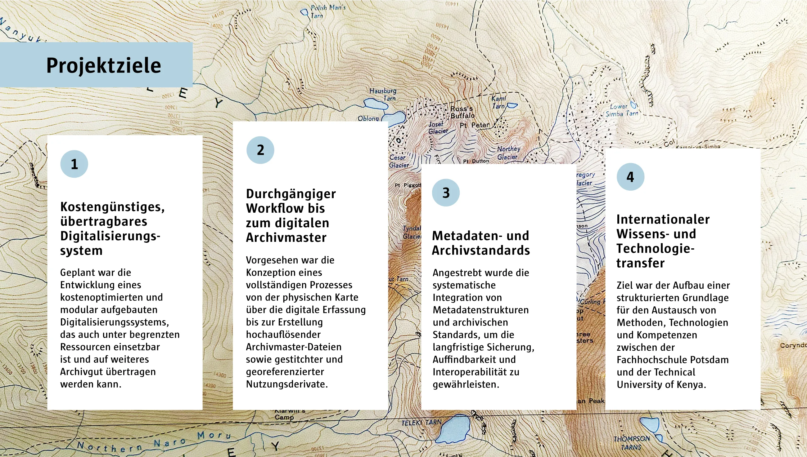 Ziel des Projektes war es, einen Workflow zur Digitalisierung und Sicherung historischen Kartenmaterials zu erschließen. Dafür wurde ein reproduzierbares Verfahren entwickelt, das technische, archivische und organisatorische Anforderungen zusammenführt. Gleichzeitig dient das Projekt als Plattform für den internationalen Austausch von Methoden, Technologien und Kompetenzen und schafft damit die Grundlage für langfristige Kooperationen mit Fokus auf die Digitalisierung von Kulturgütern.