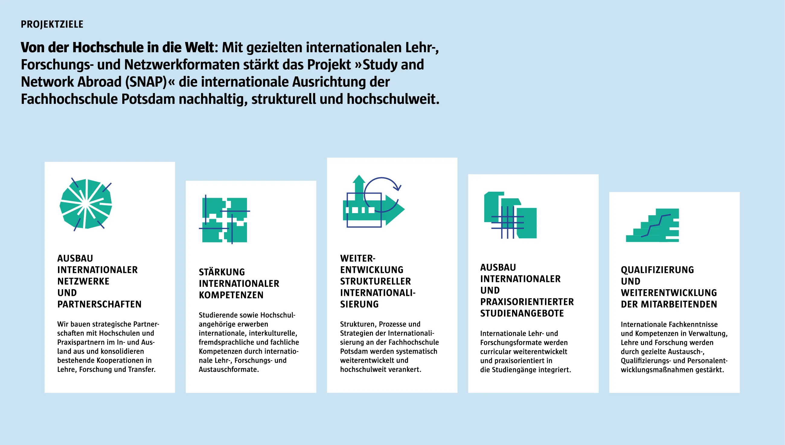Ziele des Projekts: Ausbau und Konsolidierung internationaler Netzwerke und strategischer Partnerschaften, Verankerung internationaler Lehr- und Forschungsformate in Studiengängen, Stärkung internationaler Kompetenzen von Studierenden, Lehrenden und Mitarbeitenden sowie Weiterentwicklung der strukturellen und strategischen Internationalisierung der Fachhochschule Potsdam.