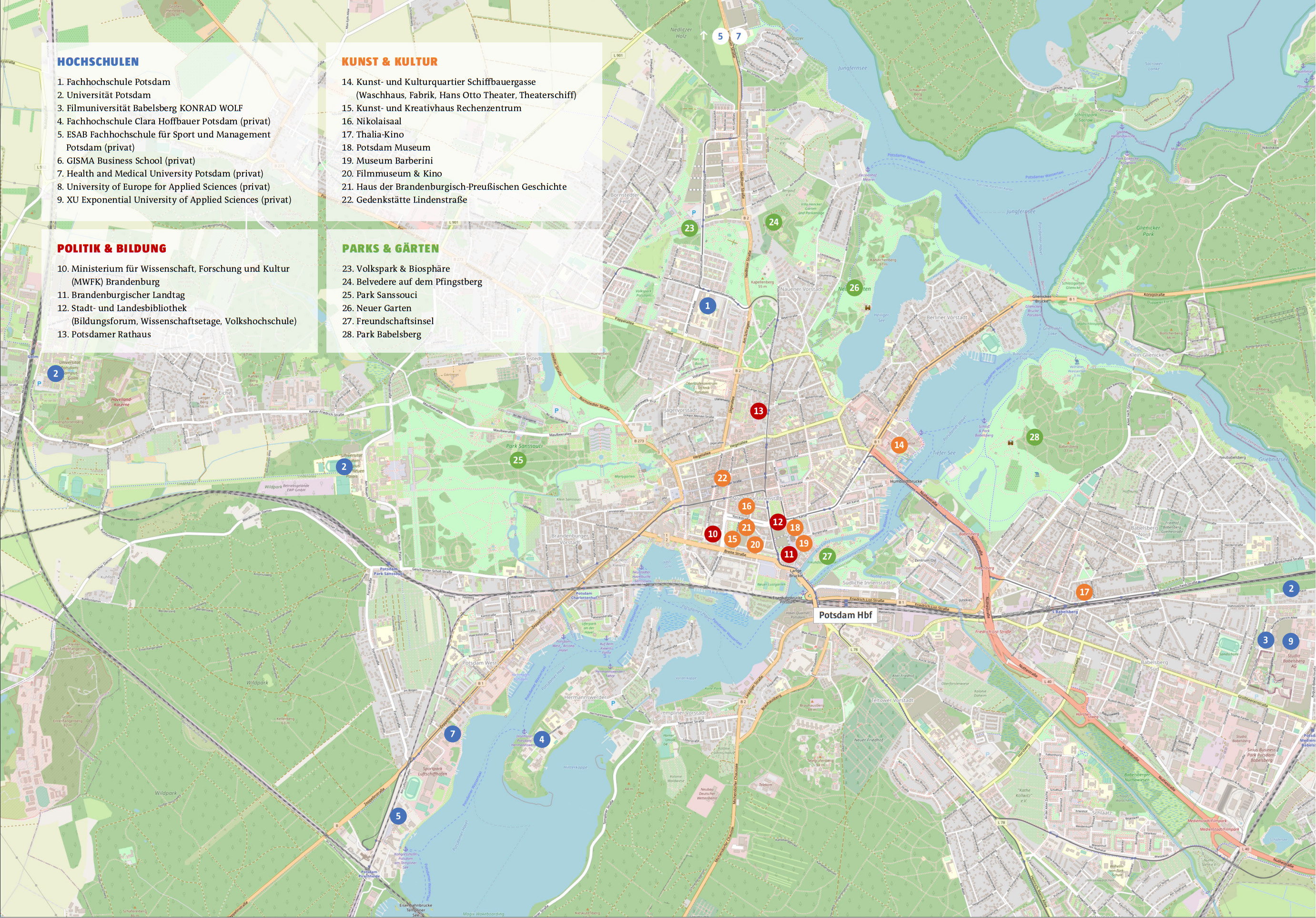 Mit Parks, Schlössern und Gärten sowie ausgeprägten kulturellen Angeboten hat Potsdam einiges zu bieten. Die wunderschöne Seenlandschaft der Havel lädt auch in der Umgebung zum Verweilen ein. Unser grüner Campus liegt im Bornstedter Feld, im Norden von Potsdam. Die Wissenschaftsstadt hat ca. 183.000 Einwohner*innen und Sie sind mittendrin! Hier finden Sie eine kleine Auswahl an interessanten Orten.