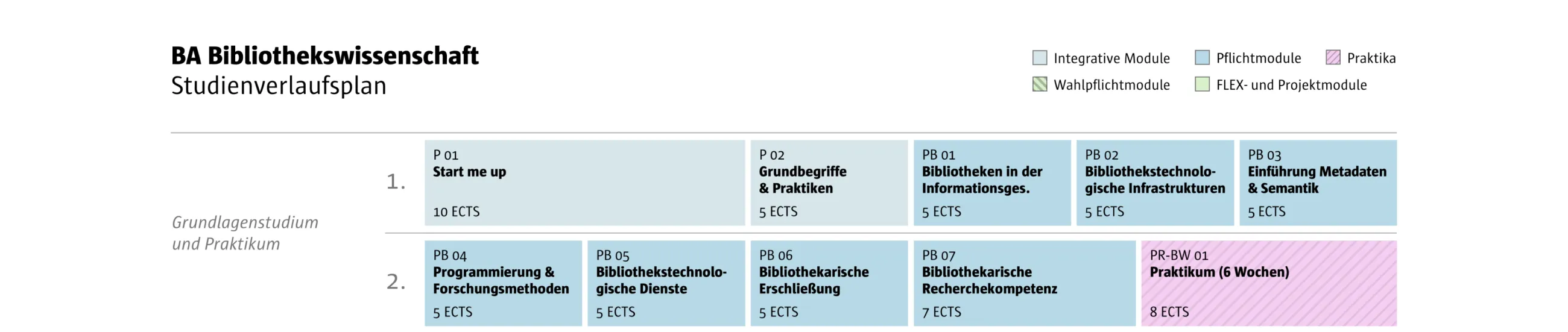 In den aktuell gültigen Modulhandbüchern und Studien- und Prüfungsordnungen des Fachbereichs Informationswissenschaften finden Sie die Modulübersicht, eine detaillierte Beschreibung der Module und Studieninhalte sowie den Studienverlaufsplan für den Studiengang Bibliothekswissenschaften.