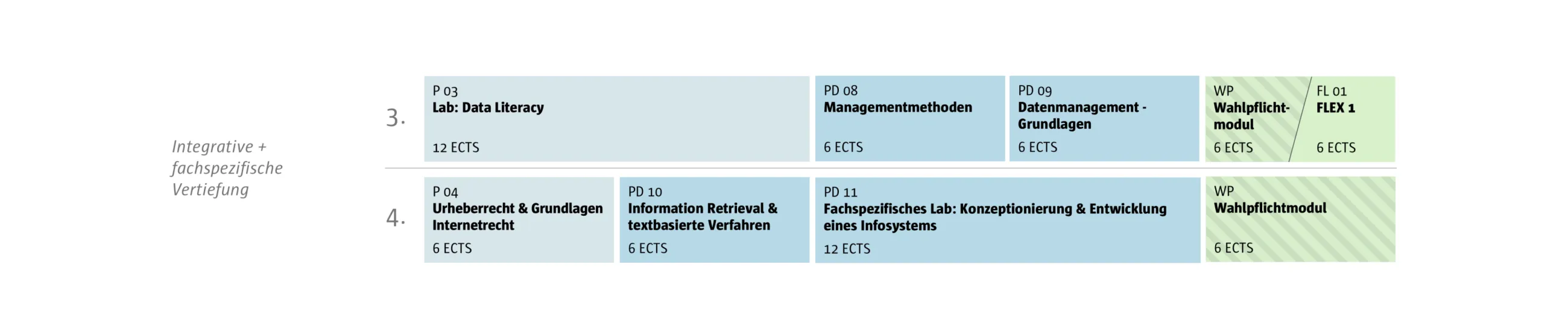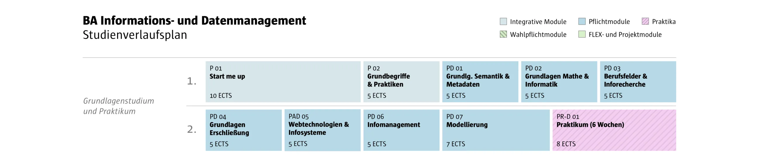 - Studienverlaufsplan Informations- und Datenmanagement (B.A.) (PDF, 505.23 KB)Der Studienverlaufsplan zeigt den empfohlenen Ablauf des Bachelorstudiums Informations- und Datenmanagement und gibt einen Überblick über die in den einzelnen Semestern vorgesehenen Module. © Fachbereich Informationswissenschaften © Fachbereich Informationswissenschaften
