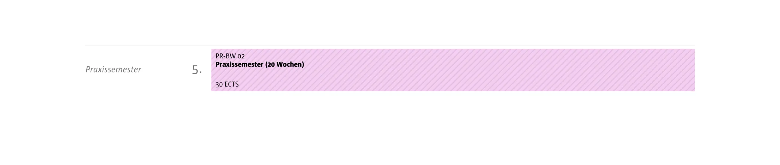 - zwei Praktika: sechs Wochen nach dem 2. Semester sowie 20 Wochen im 5. Semester